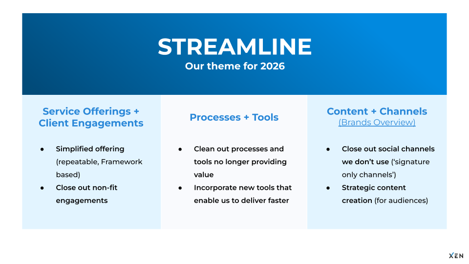 For XEN, we’re making streamline our guiding theme. We’re applying this principle to our internal processes, our tech stack, our product and service offerings, and the engagements we have with clients.